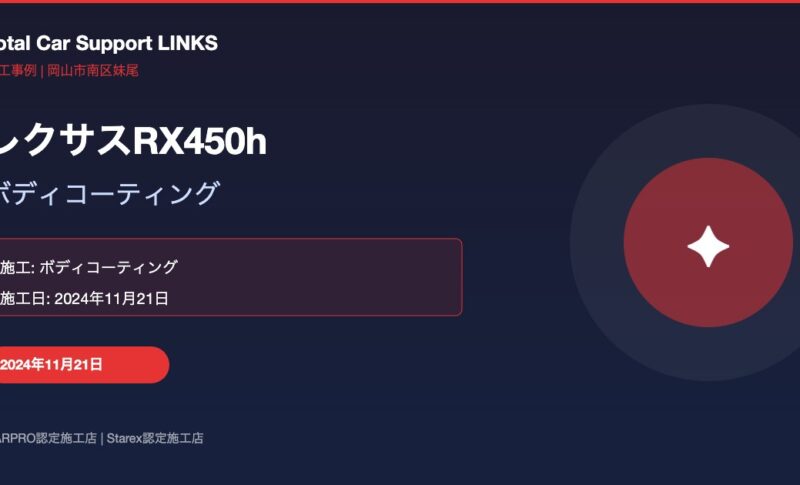 レクサスRX450hをお預かりし、ボディコーティングを施工しました。岡山市南区妹尾のTotal Car Support LINKSでは、大切なお車の塗膜面を長期間守る高品質なコーティングをご提供しています。岡山・倉敷・総社エリアを中心に、遠方からもご来店いただく実績あるカーコーティング専門店です。オーナー様のご要望をしっかりとお伺いし、お車の状態・使用環境に合わせた最適な施工プランをご提案。今回も丁寧なヒアリングを行ったうえで、ボディコーティングでの仕上げに取り組みました。