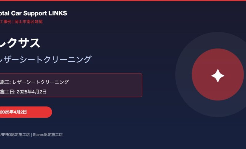また、Starex水性コーティングはLINKSの親会社である株式会社アンドクレアが認定施工店ネットワークを展開しており、LINKSはその認定施工店として正規トレーニングを修了しています。日々のお手入れをラクにしながら、大切なシートを長く綺麗に保ちたいオーナー様にぜひご検討いただきたいサービスです。